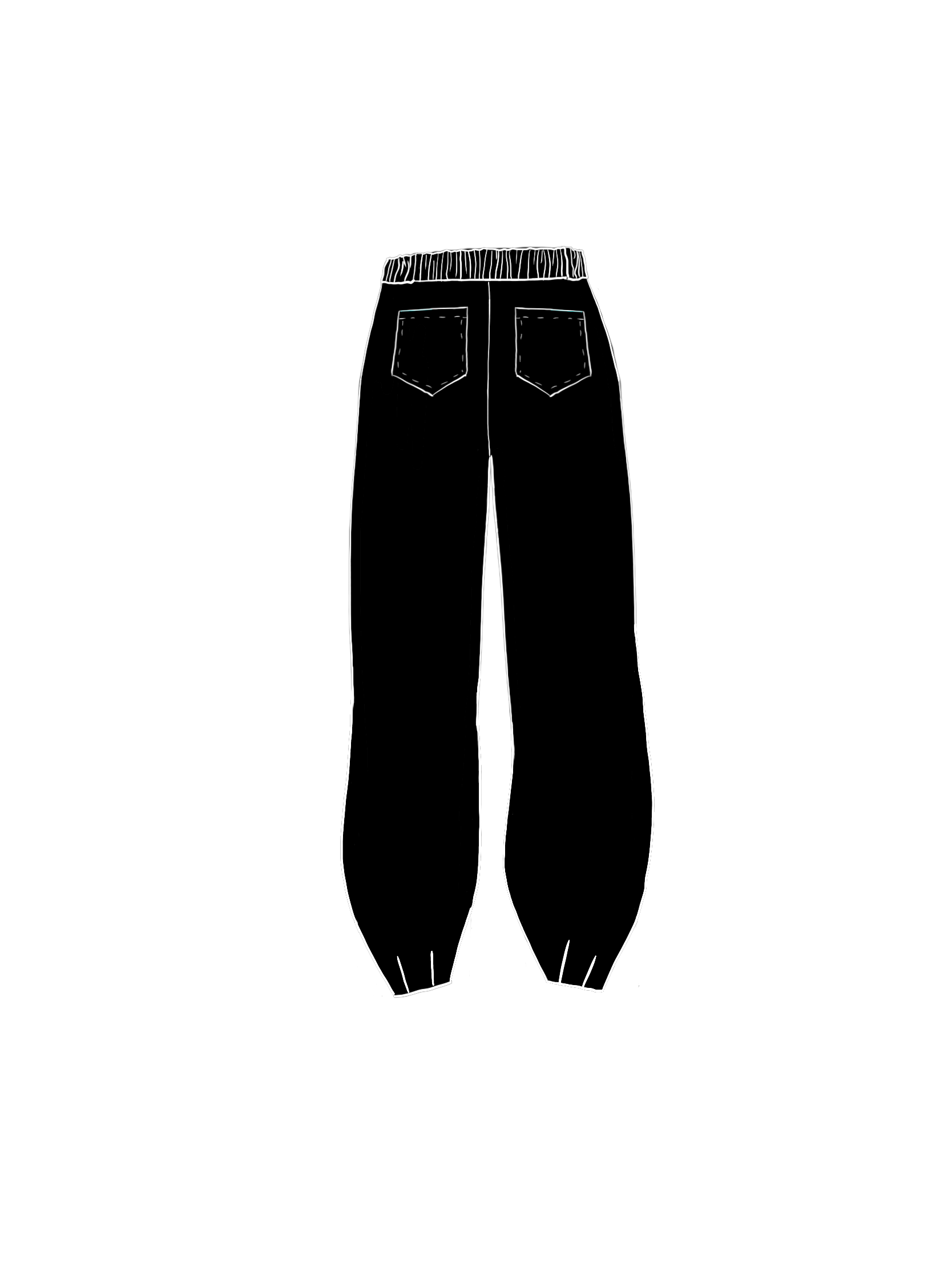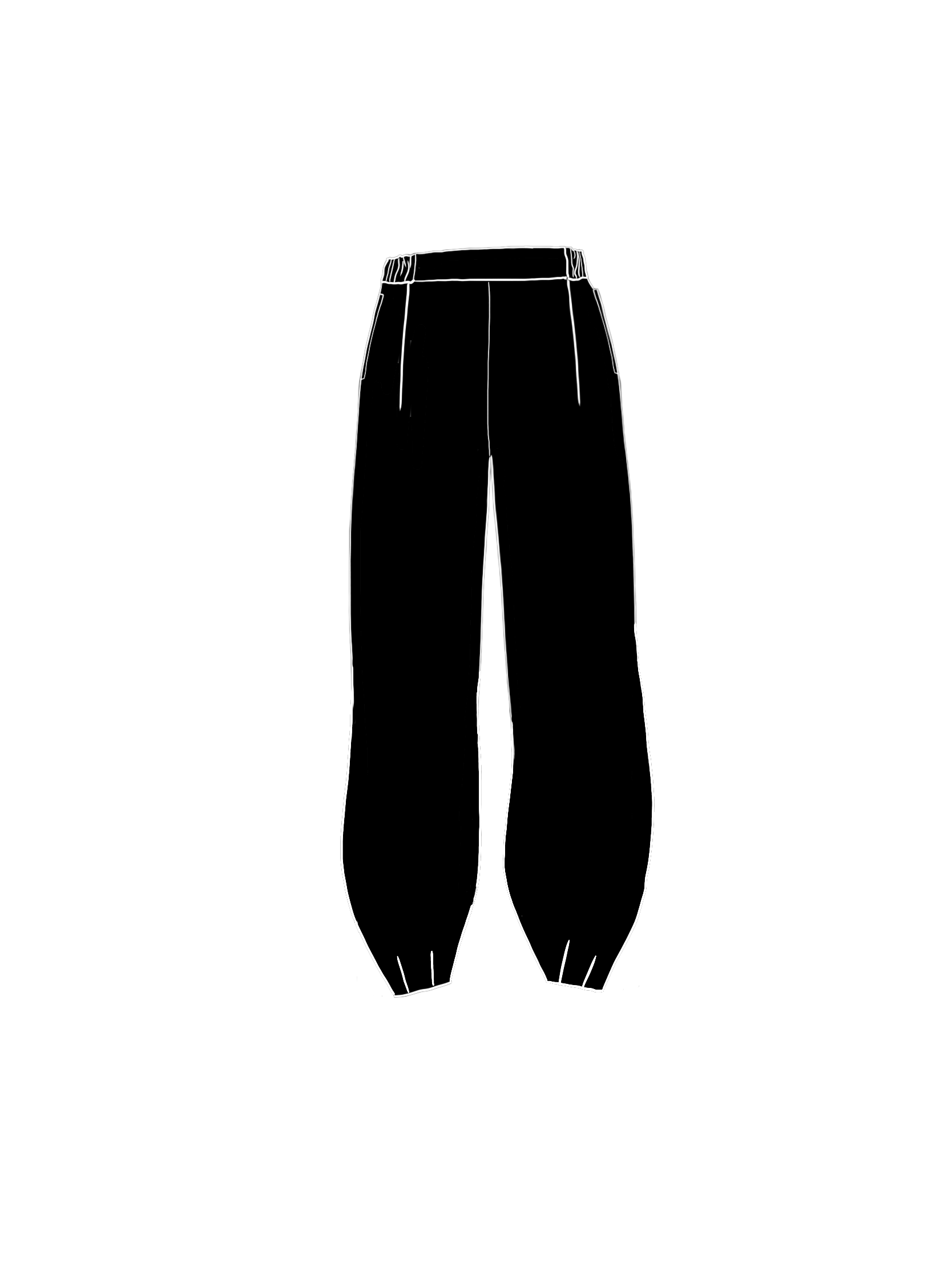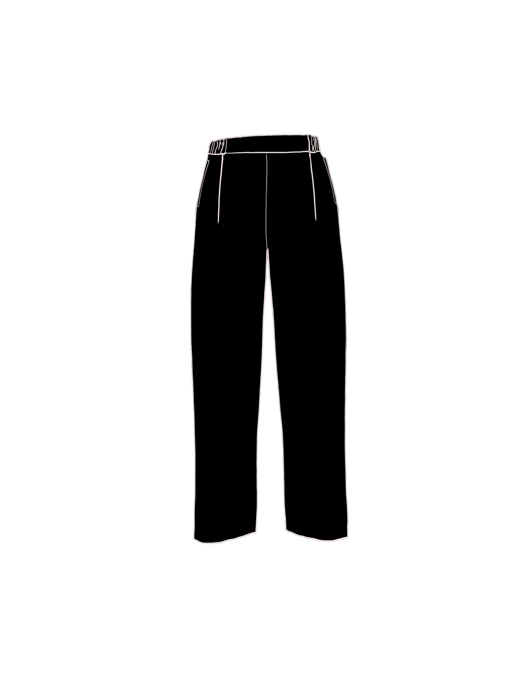 Two inside pockets, two Patch back pockets, Elasticated waist with flat front for a tailored look, 2 leg design options: Wide leg or barrel leg with 4 darts at the hem to cinch the fabric in.