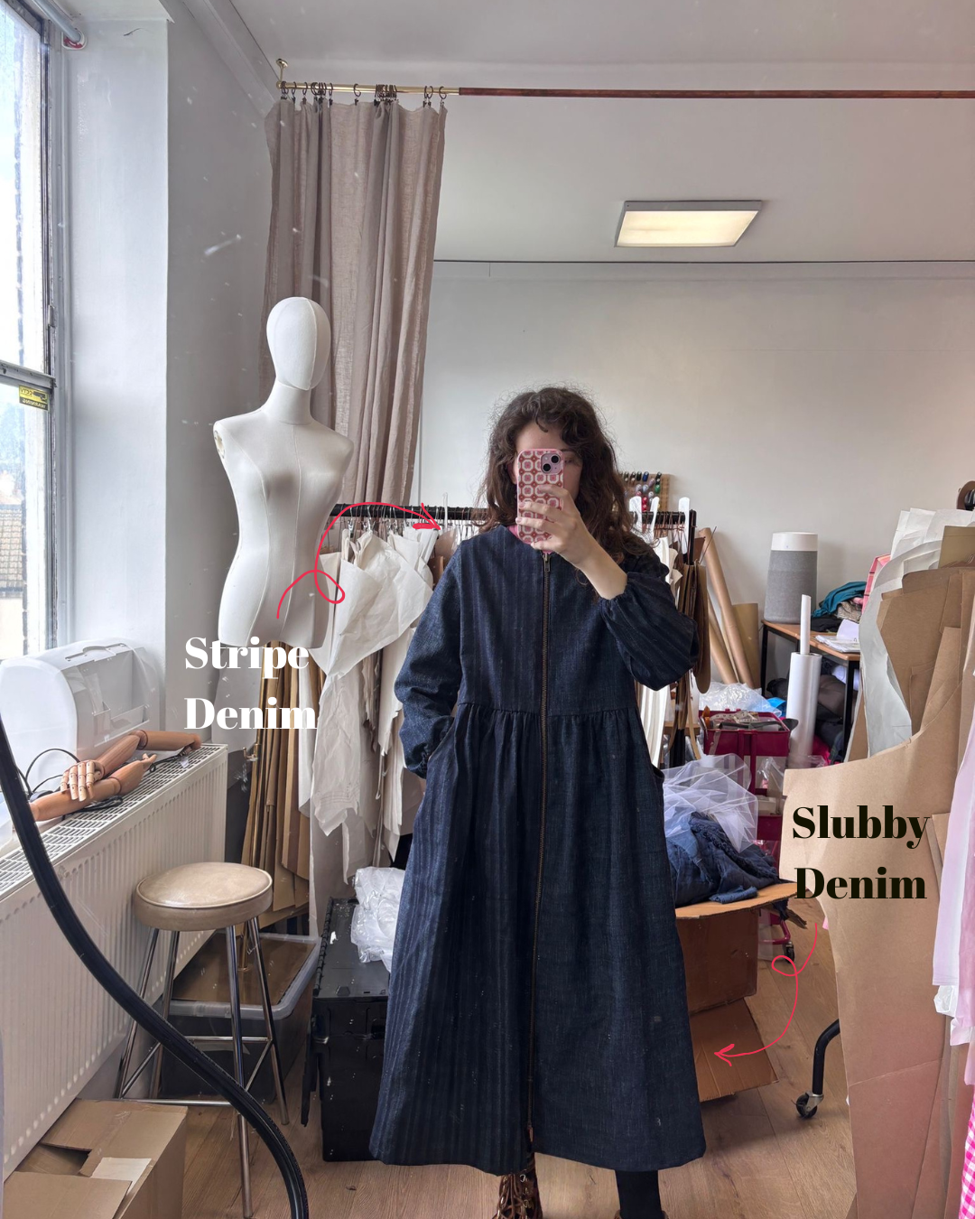 This is a deadstock Stripe Denim made from 100% cotton. I never buy new denim and I always make sure there is no plastic in the deadstock denims I do work with.