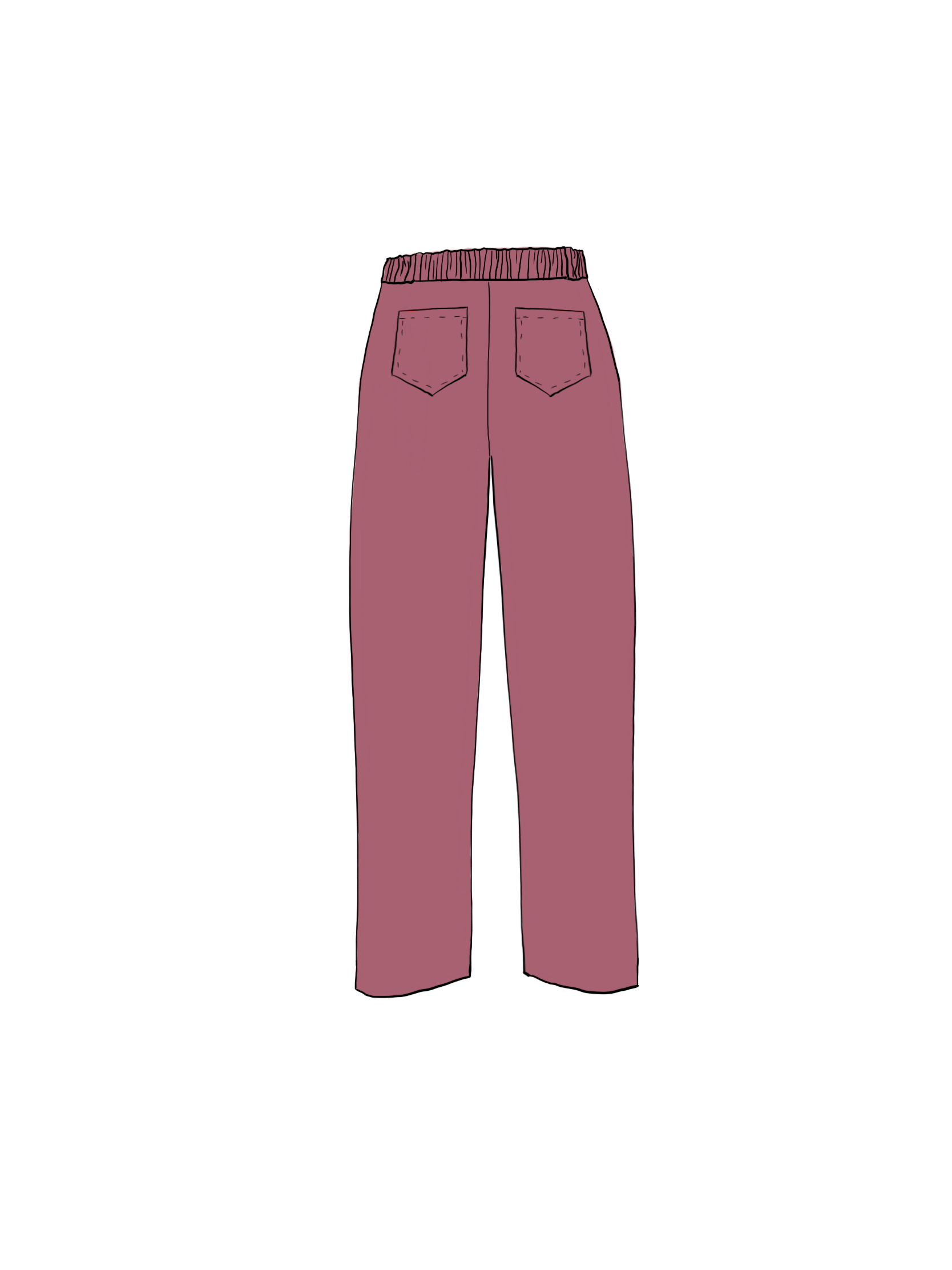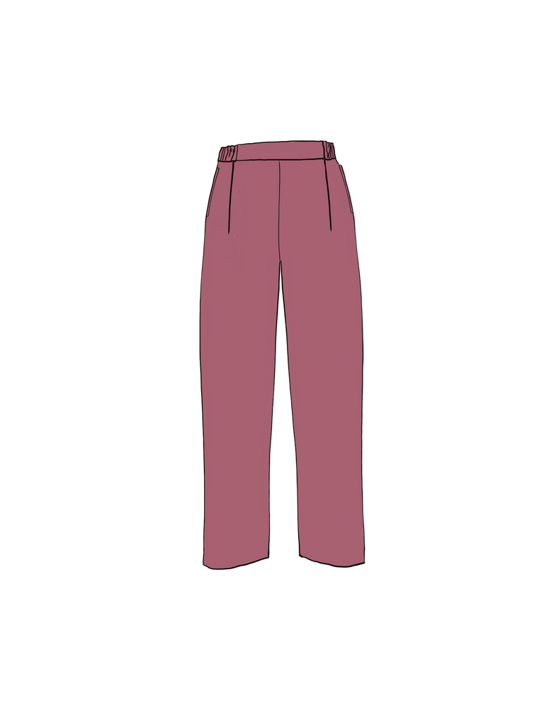 Two inside pockets, two Patch back pockets, Elasticated waist with flat front for a tailored look, 2 leg design options: Wide leg or barrel leg with 4 darts at the hem to cinch the fabric in.