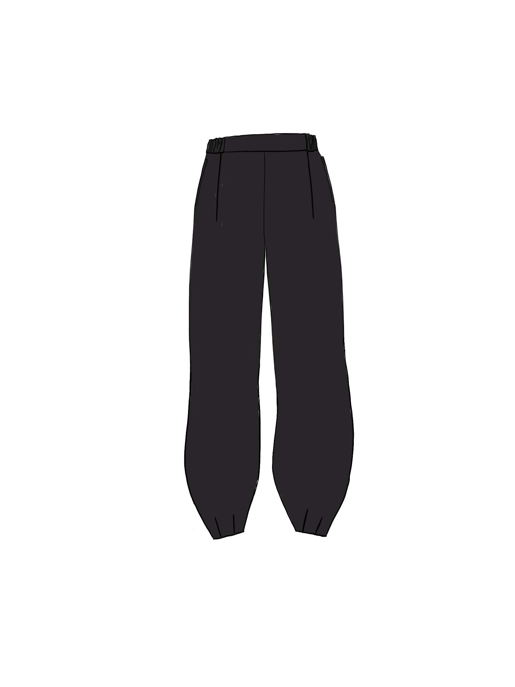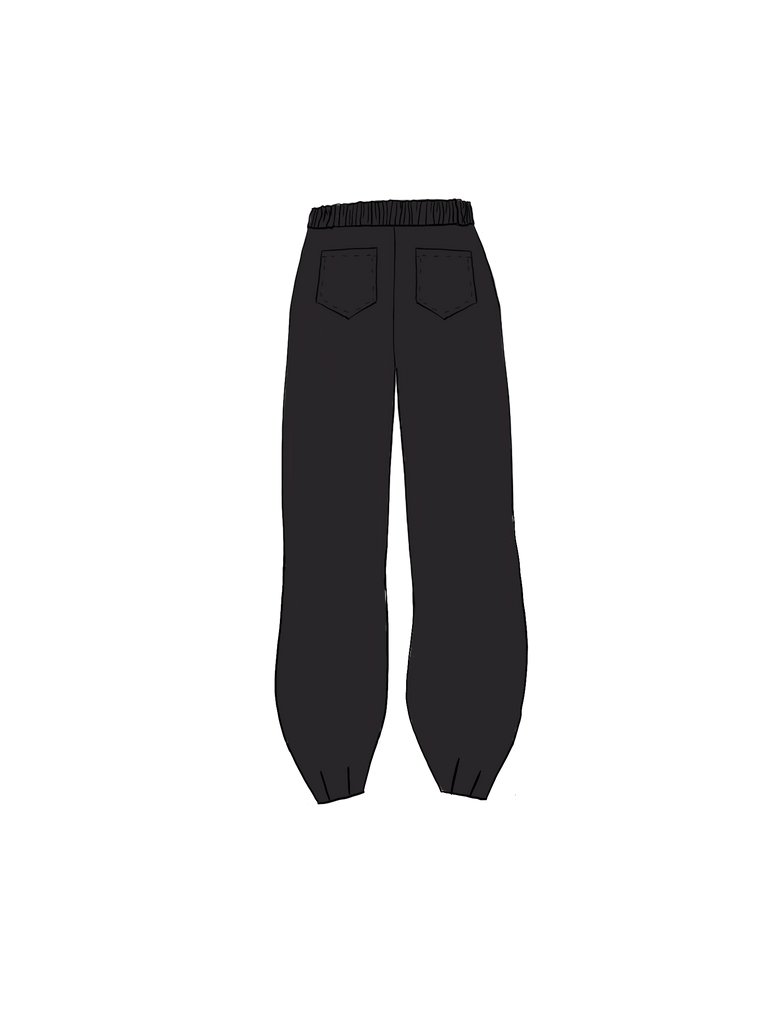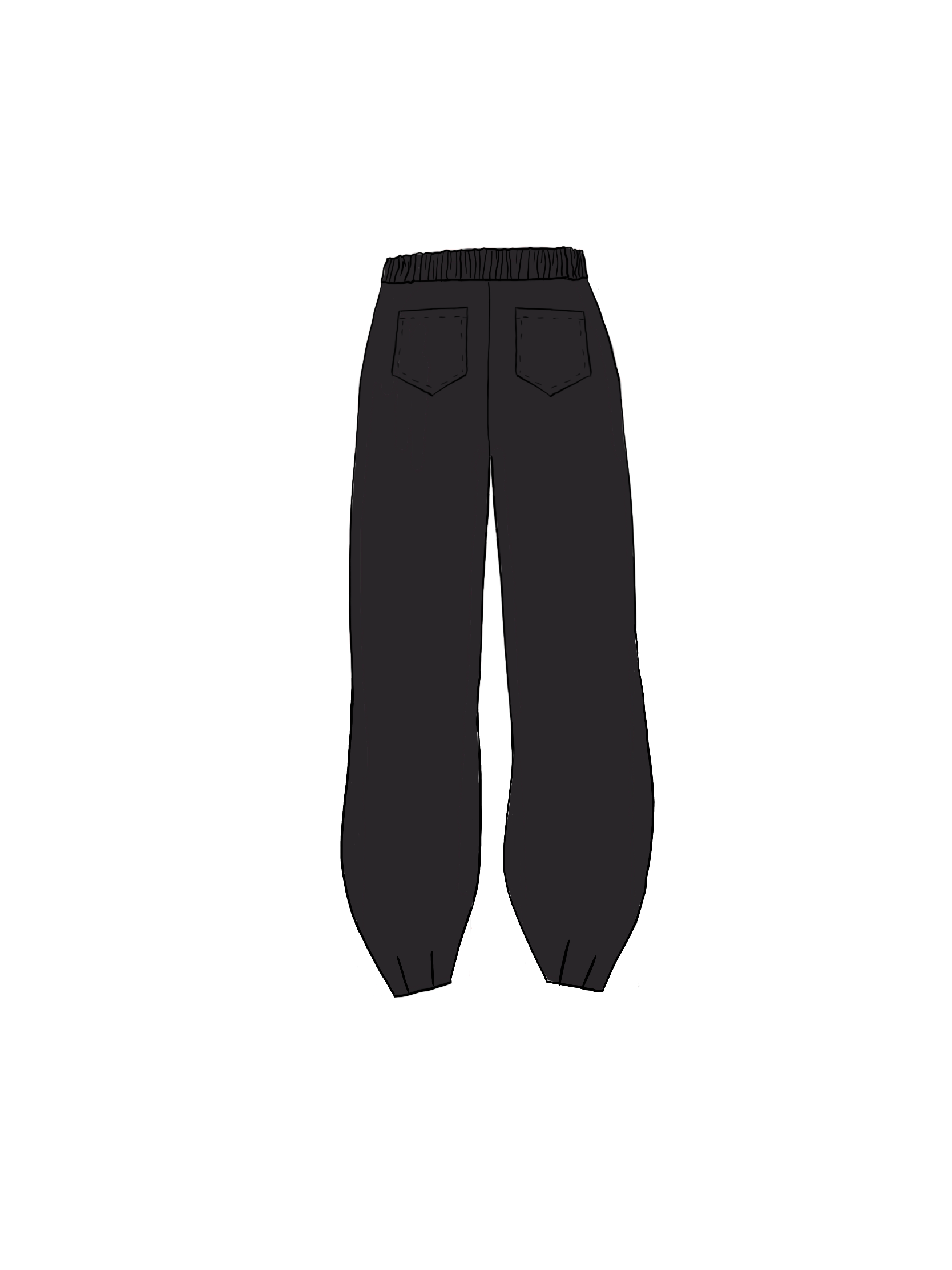 Two inside pockets, two Patch back pockets, Elasticated waist with flat front for a tailored look, 2 leg design options: Wide leg or barrel leg with 4 darts at the hem to cinch the fabric in.