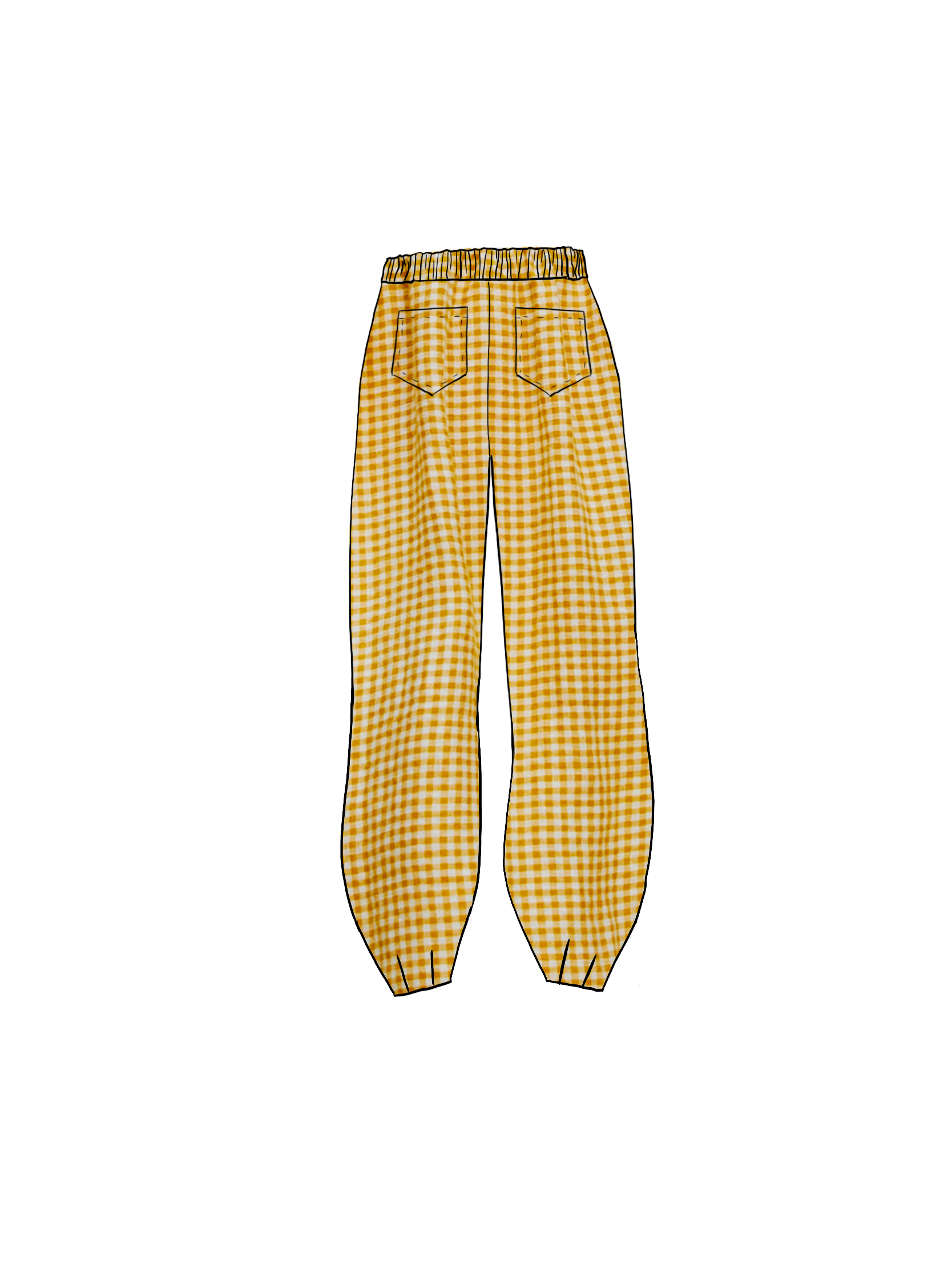 Two inside pockets, two Patch back pockets, Elasticated waist with flat front for a tailored look,  2 leg design options: Wide leg or barrel leg with 4 darts at the hem to cinch the fabric in.