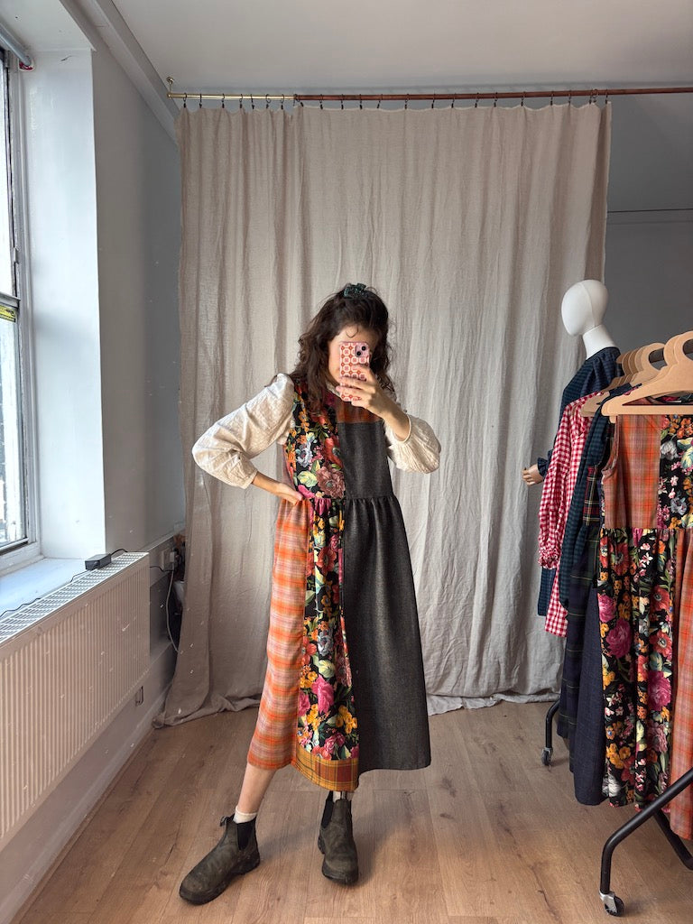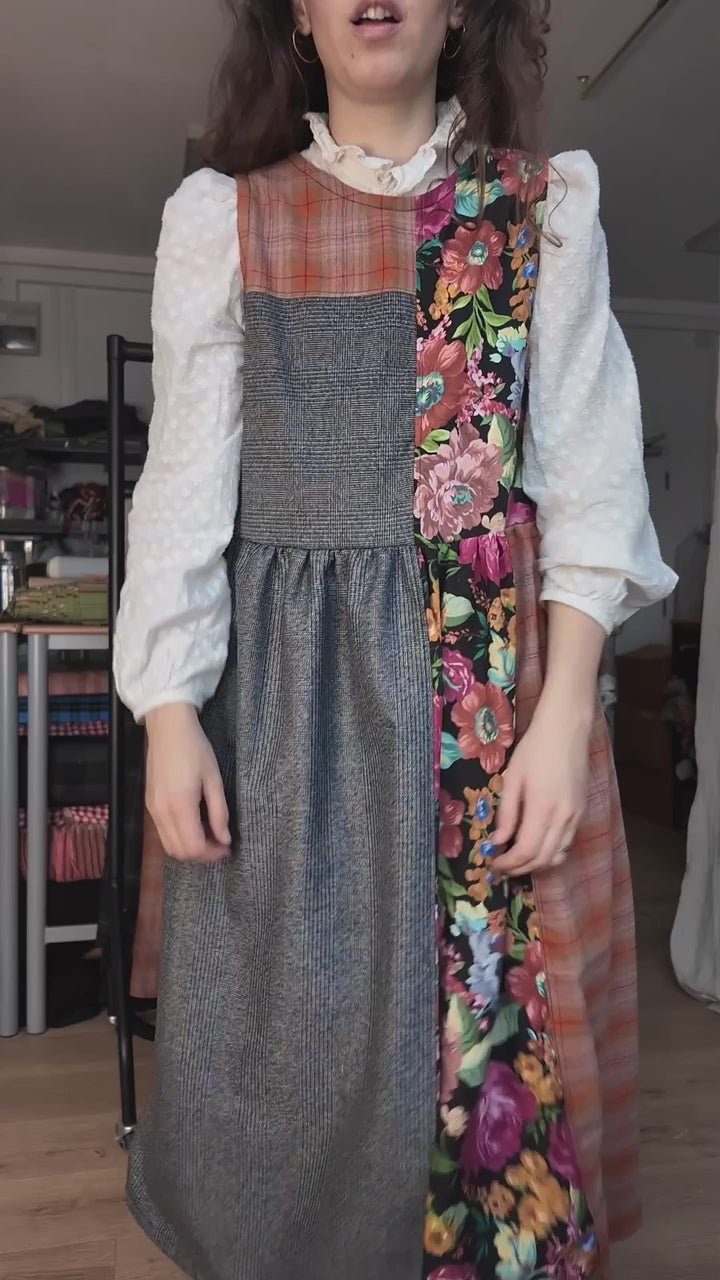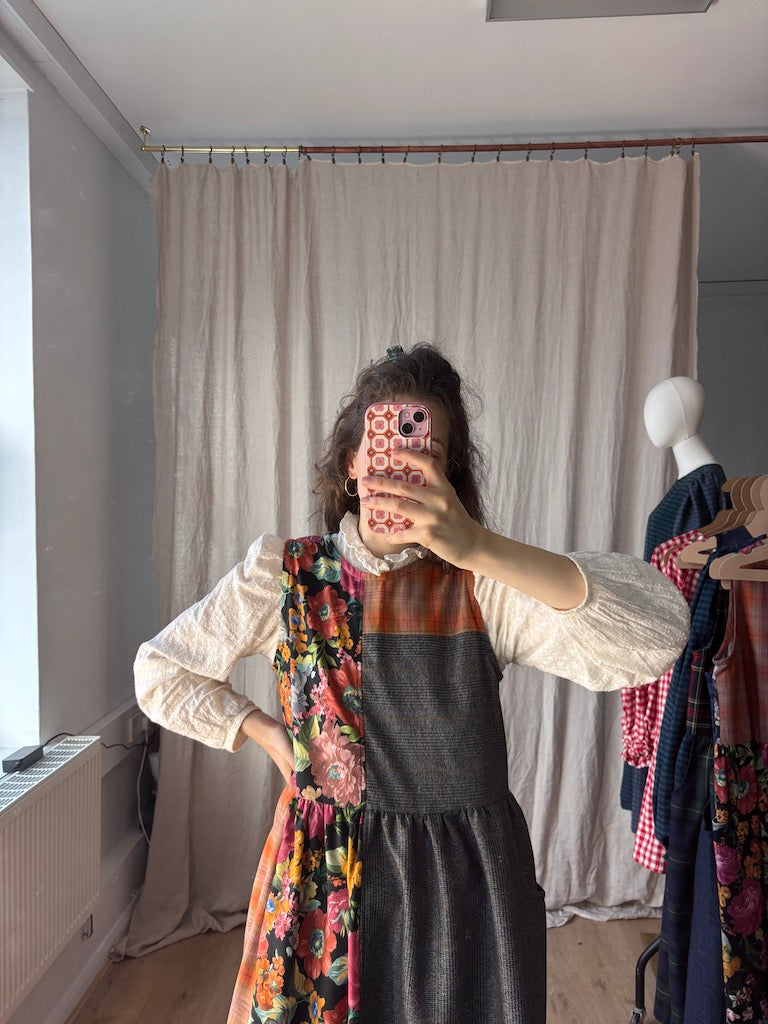 A carefully assembled mix & match of floral and check fabrics in size small.