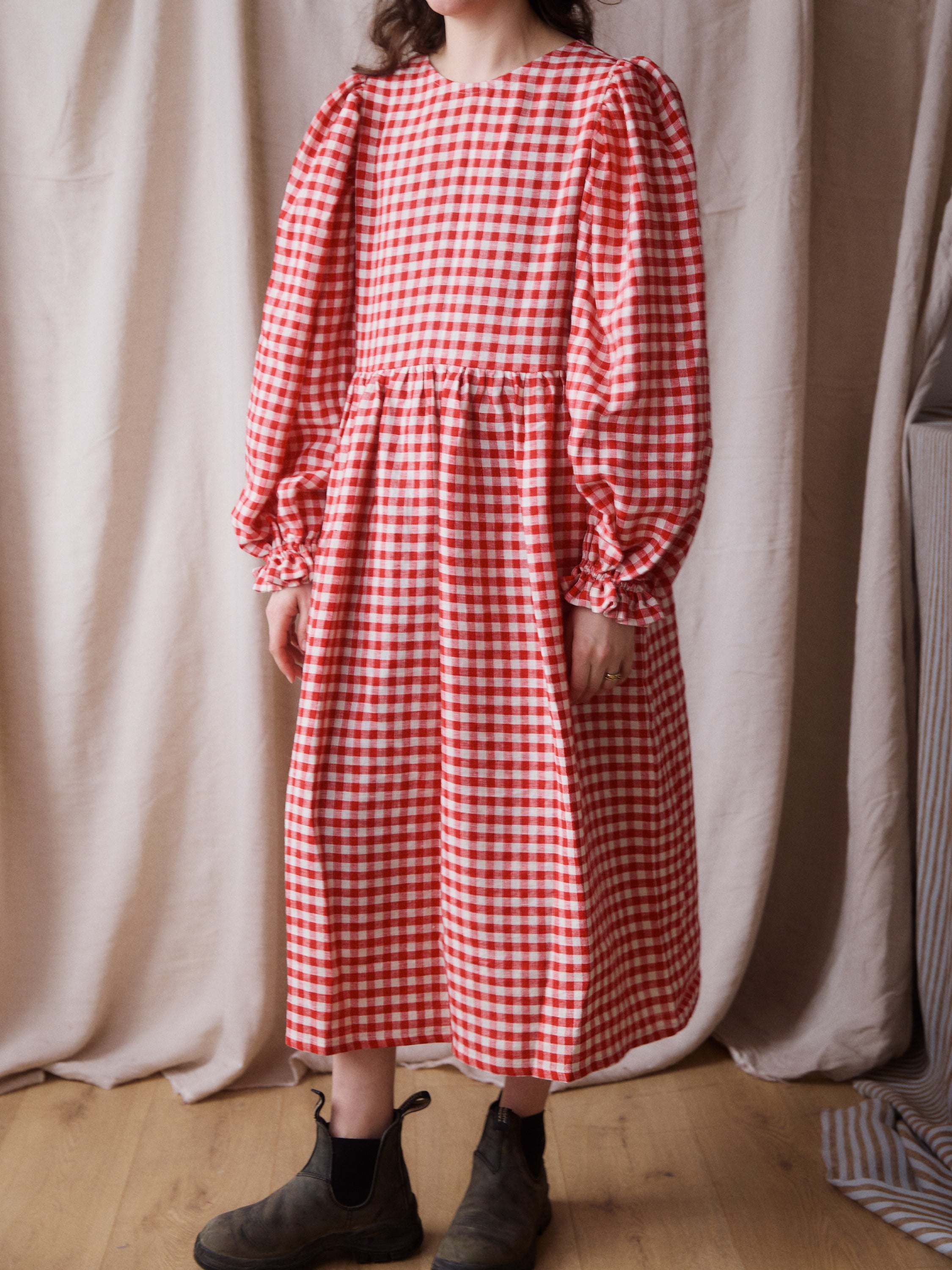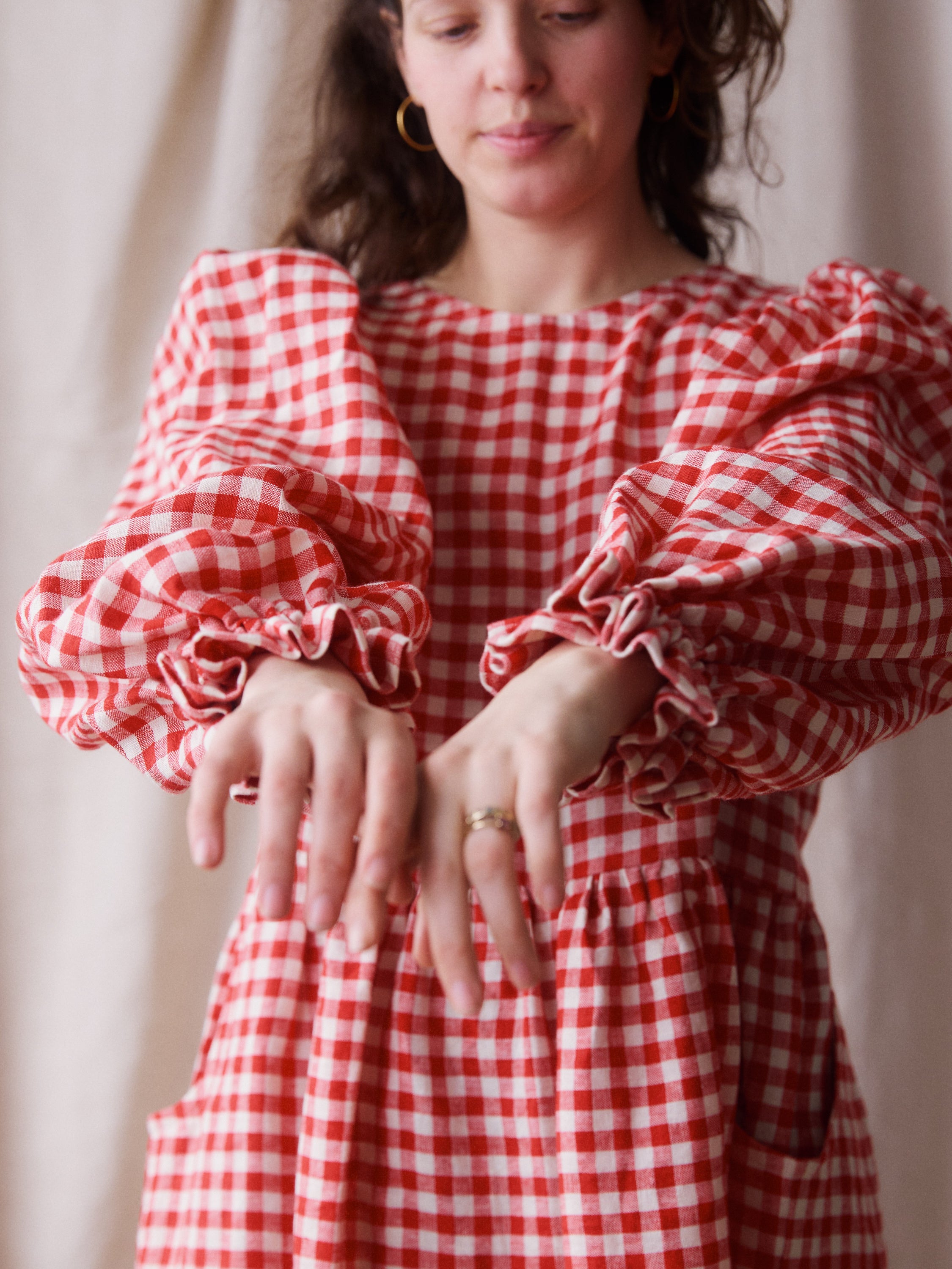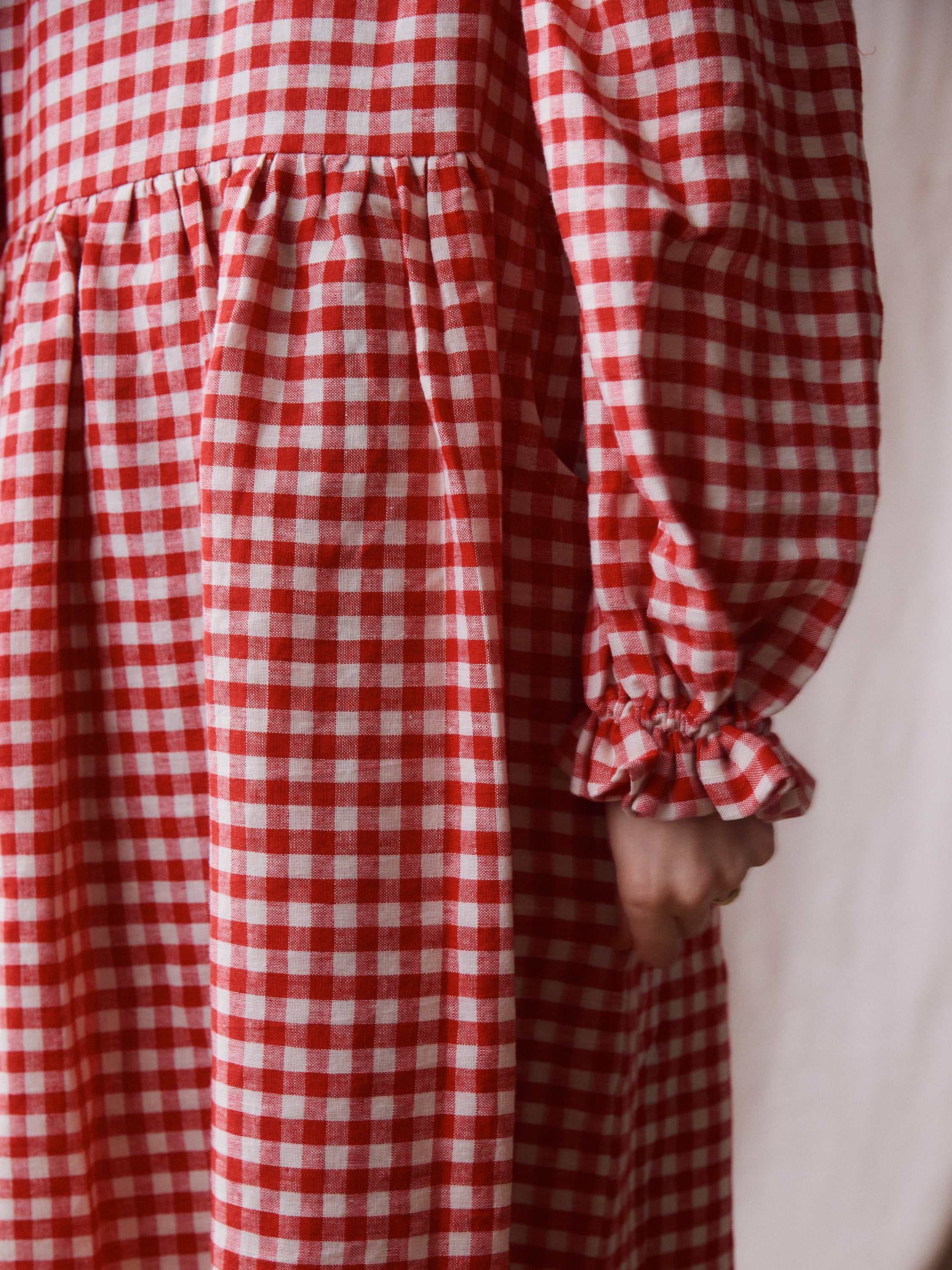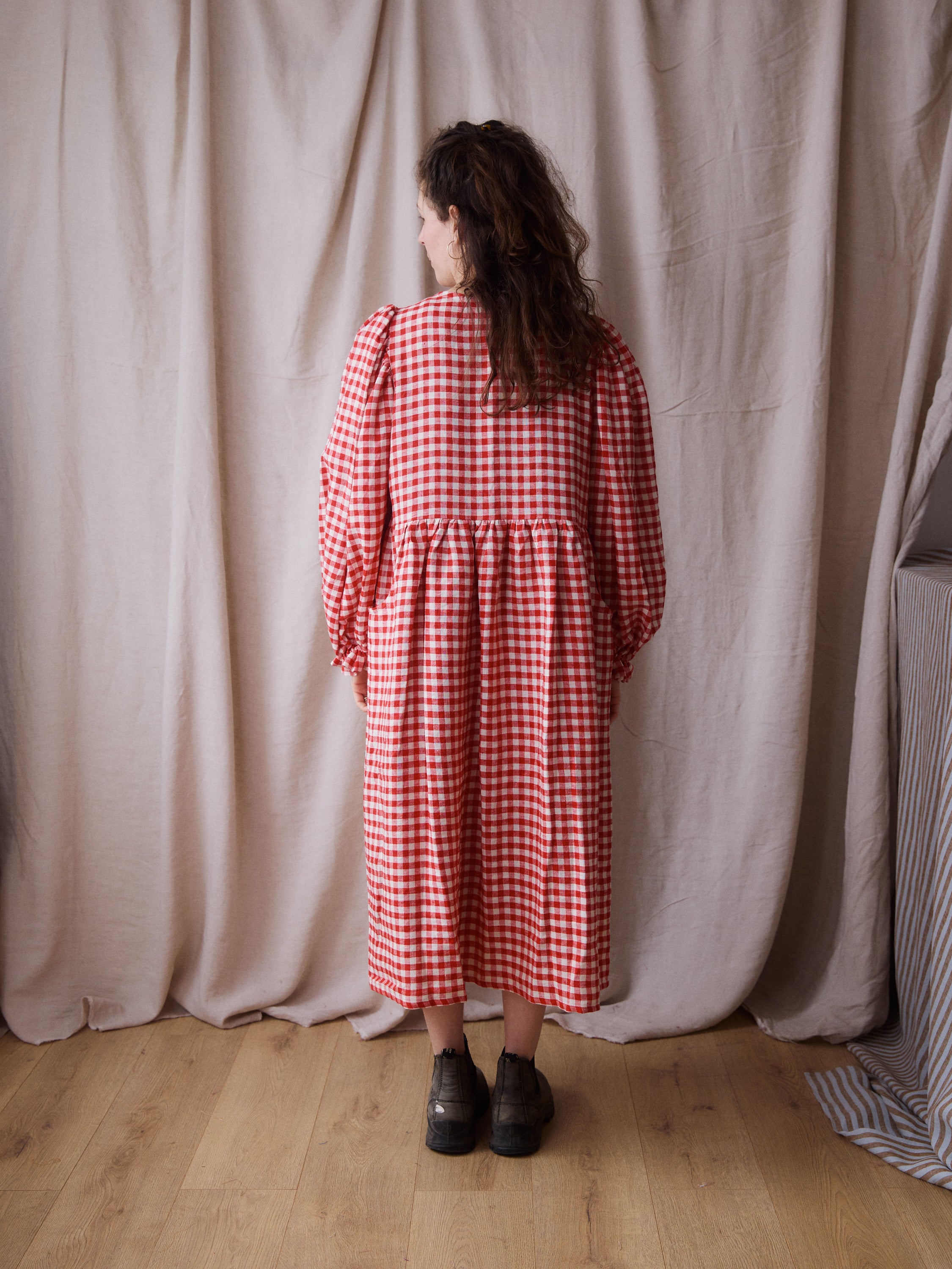 Luna Dress - Red Gingham Linen- BFOsleeves - Small - RTS