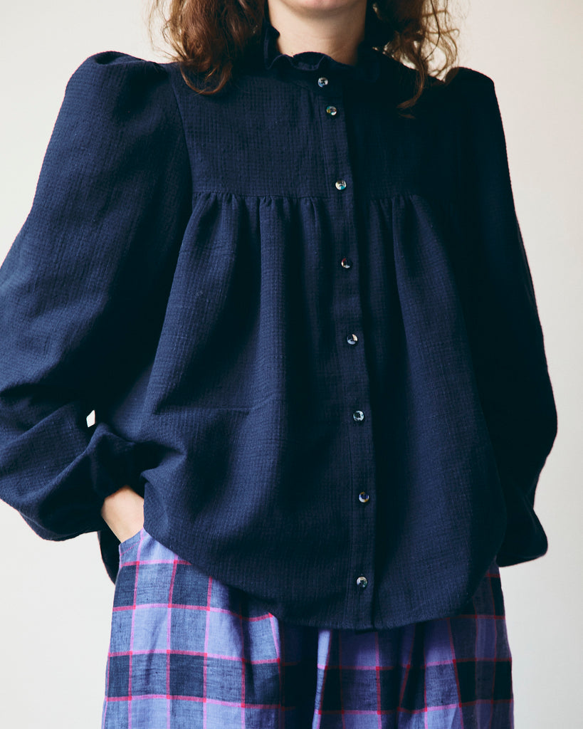 The Vita Shirt details: Front gathers, front buttons, your choice of standard or puffy shoulders, elasticated cuffs, your choice of a simple or frilled neck.