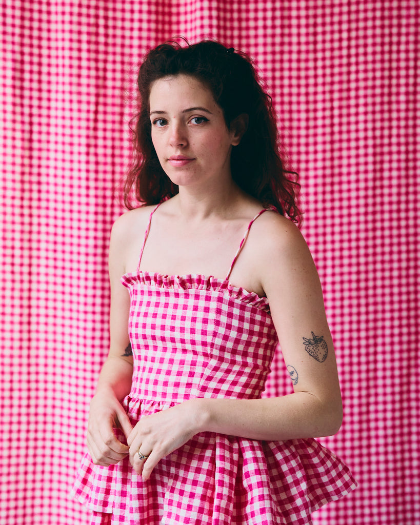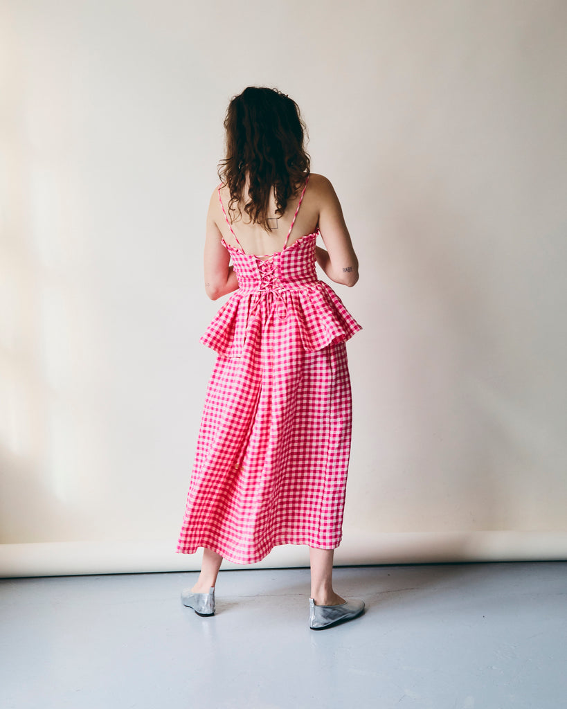 The Wren dress details: A more fitted dress, frilled neckline, thin shoulder straps, corseted back, peplum at the waist and 2 pockets.